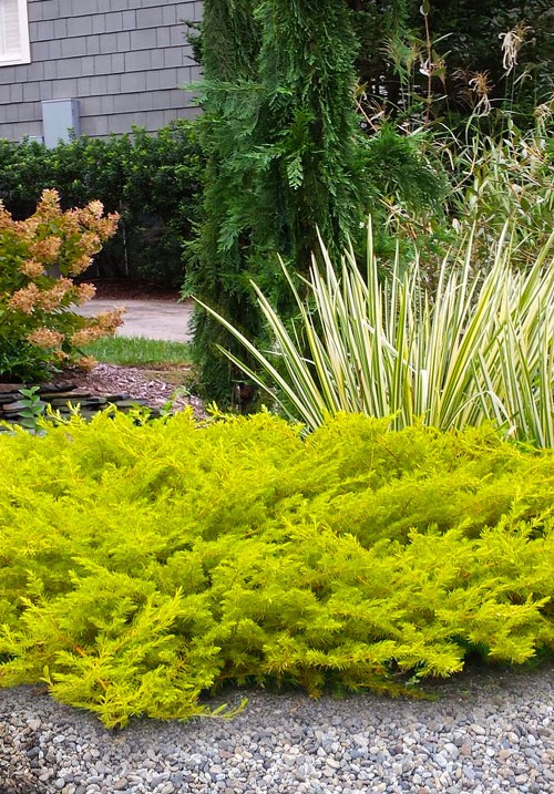 Ima zlatno-žutu boju . Preko zime poprima boju starog zlata (bronce). Dobro se kombinira s visokom zelenom i plavom crnogoricom. |