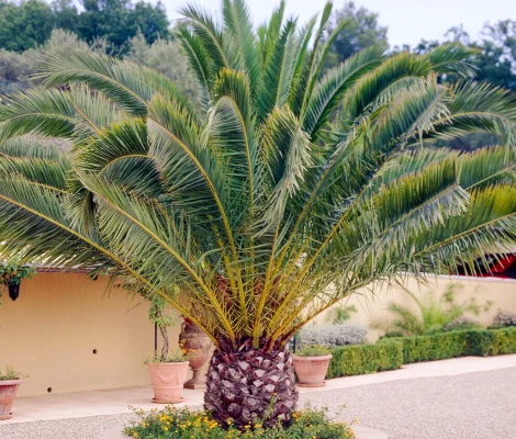 | Phoenix canariensis / datulja je zimzeleno stablo iz porodice palma. To su biljke uglavnom uspravnog stabla koje na vrhu nose skupinu velikih razdijeljenih listova. Cvjetovi su im obično neugledni, sitni, češće jednospolni. Kanarska datulja ili lat. Phoenix canariensis je uspravna palma snažna debla. Perasti povijeni listovi dugi su do 5 m, kad je stablo potpuno izraslo postiže visinu 15 – 18 m, a širina krošnje joj je 10 m. | |